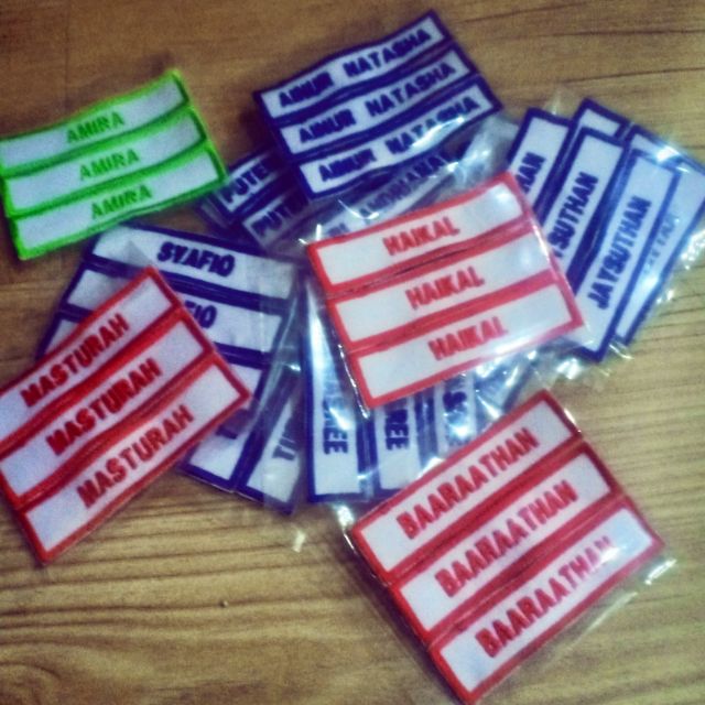 Sebab ada sorang akak tu kata sekolah anak dia cikgu suruh buat balik tanda nama yang baru sebab tersalah warna. Nametag dijahit dengan kemas tidak berbulu sulaman yang padat. MENYEDIAKAN PERKHIDMATAN SULAM NAME TAG YANG TERJAMIN KUALITINYA.